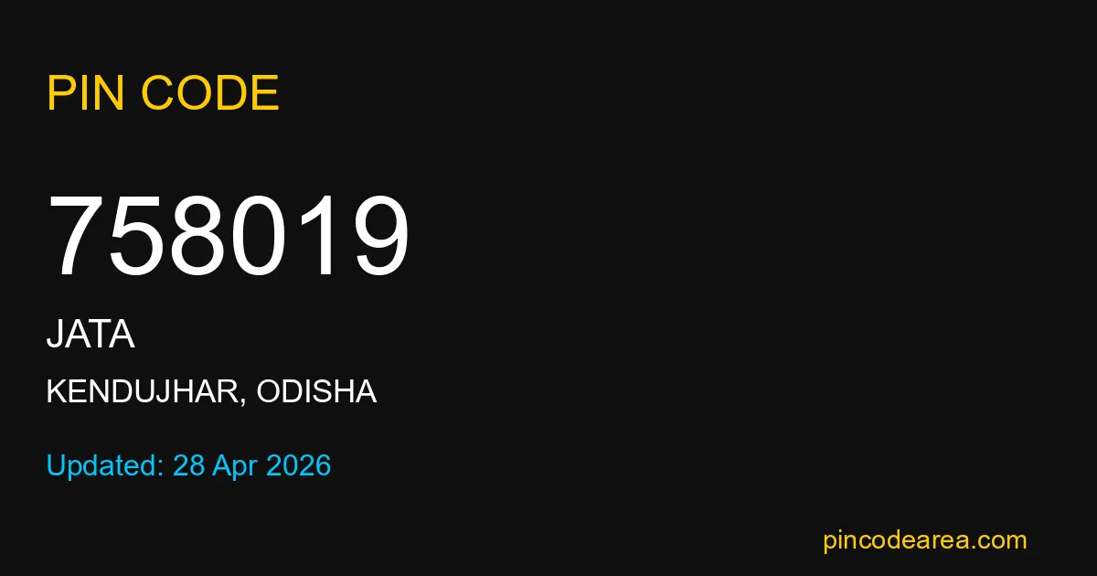 758019 PIN Code is assigned to Jata Post Office located in Kendujhar district of Odisha. It helps identify the exact delivery area for postal and courier services.