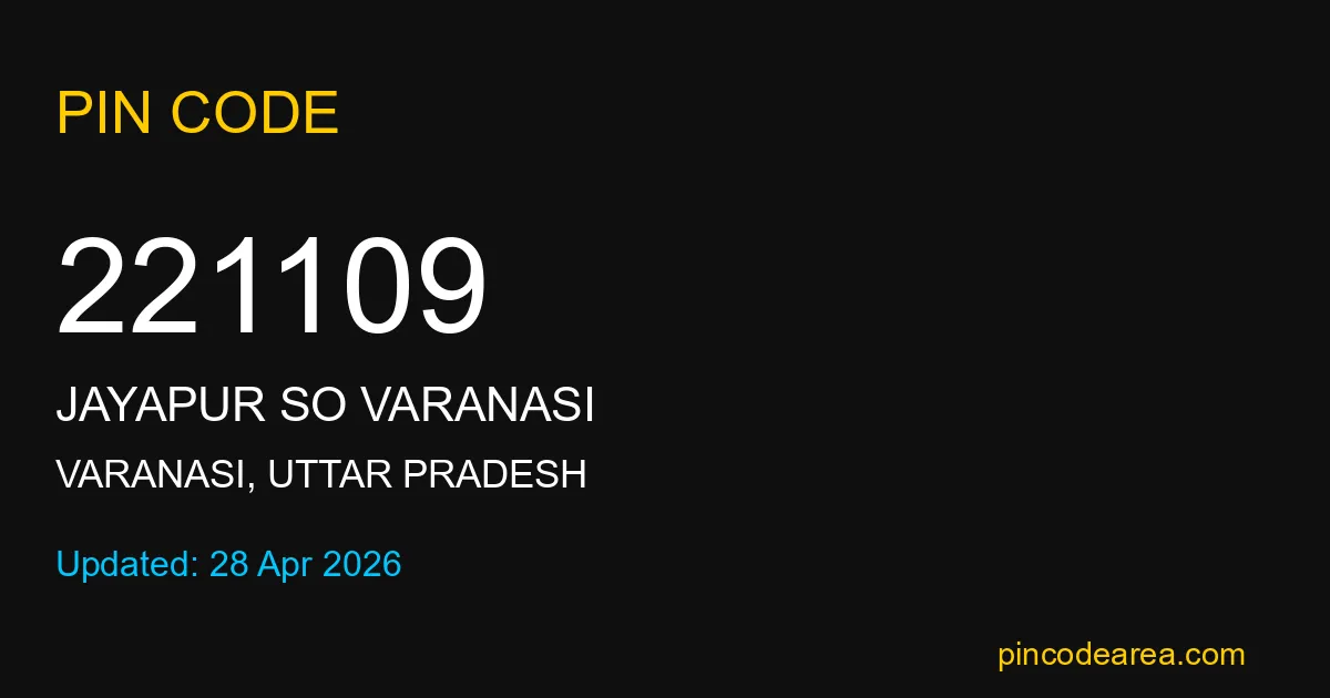 221109 PIN Code is assigned to Jayapur SO Varanasi Post Office located in Varanasi district of Uttar Pradesh. It helps identify the exact delivery area for postal and courier services.
