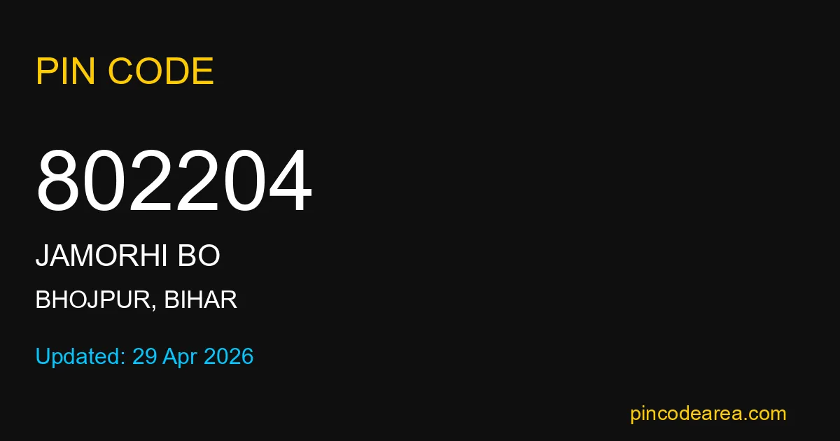 802204 PIN Code is assigned to Jamorhi BO Post Office located in Bhojpur district of Bihar. It helps identify the exact delivery area for postal and courier services.