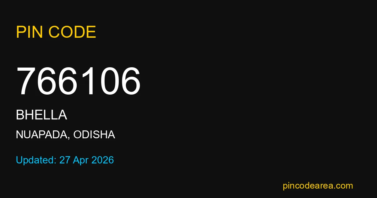 766106 PIN Code is assigned to Bhella Post Office located in Nuapada district of Odisha. It helps identify the exact delivery area for postal and courier services.