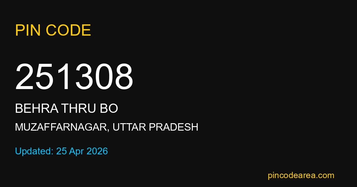 251308 PIN Code belongs to Behra Thru BO Post Office in Muzaffarnagar district of Uttar Pradesh, India. This area mainly includes local residential and rural regions where India Post ensures timely mail and parcel delivery services.