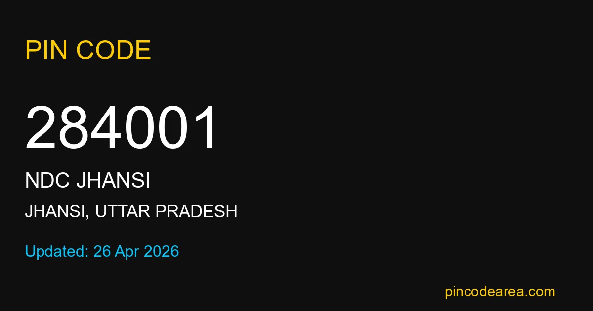 284001 PIN Code is assigned to NDC Jhansi Post Office located in Jhansi district of Uttar Pradesh. It helps in identifying the exact delivery area.