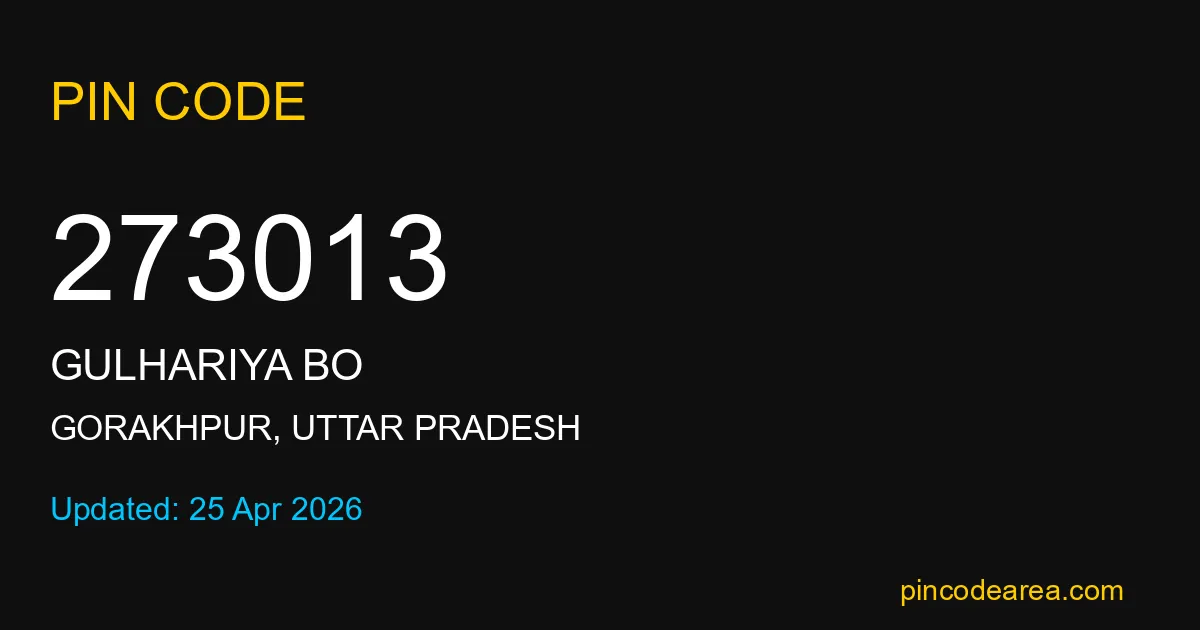 273013 PIN Code is assigned to Gulhariya BO Post Office located in Gorakhpur district of Uttar Pradesh. It helps in identifying the exact delivery area.