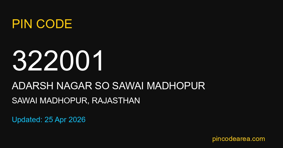 322001 PIN Code is assigned to Adarsh Nagar SO Sawai Madhopur Post Office located in Sawai Madhopur district of Rajasthan. It helps in identifying the exact delivery area.