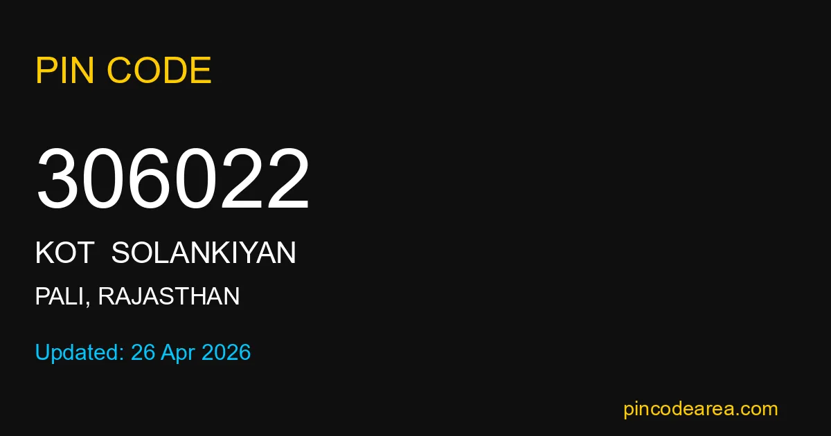 306022 PIN Code belongs to Kot Solankiyan Post Office in Pali district of Rajasthan, India. This area mainly includes local residential and rural regions where India Post ensures timely mail and parcel delivery services.