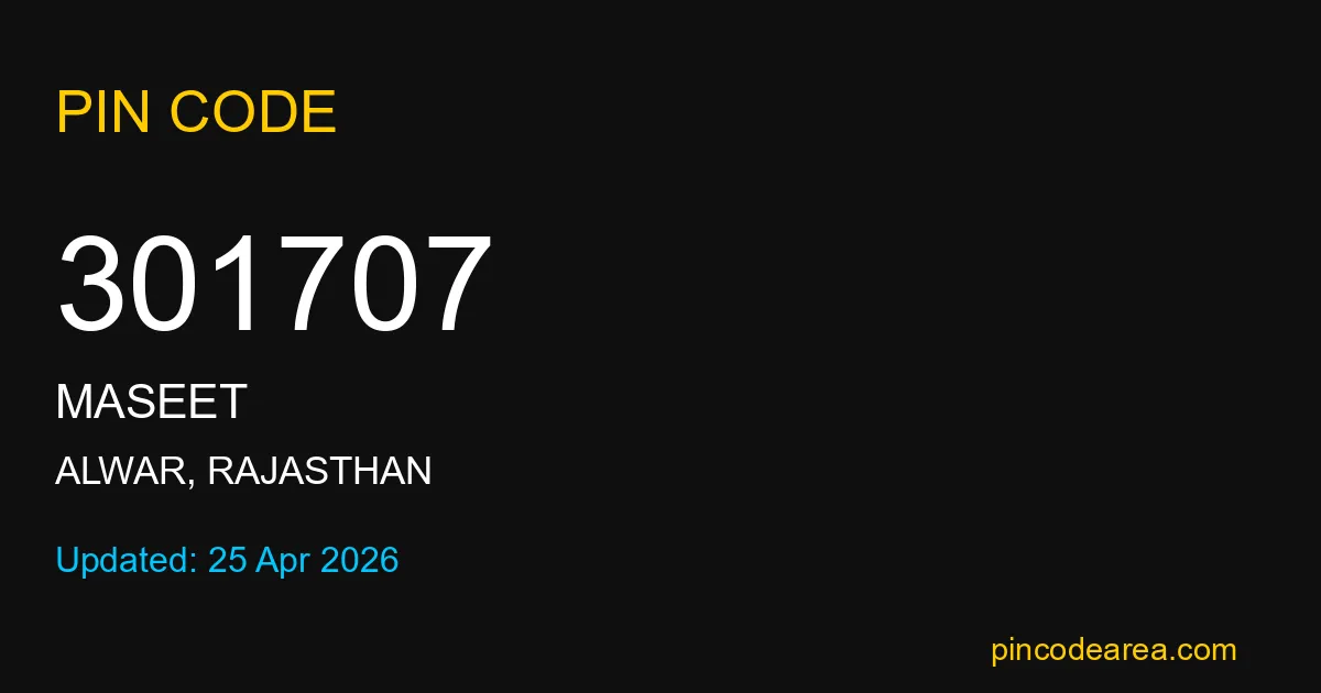 301707 PIN Code is assigned to Maseet Post Office located in Alwar district of Rajasthan. It helps in identifying the exact delivery area.