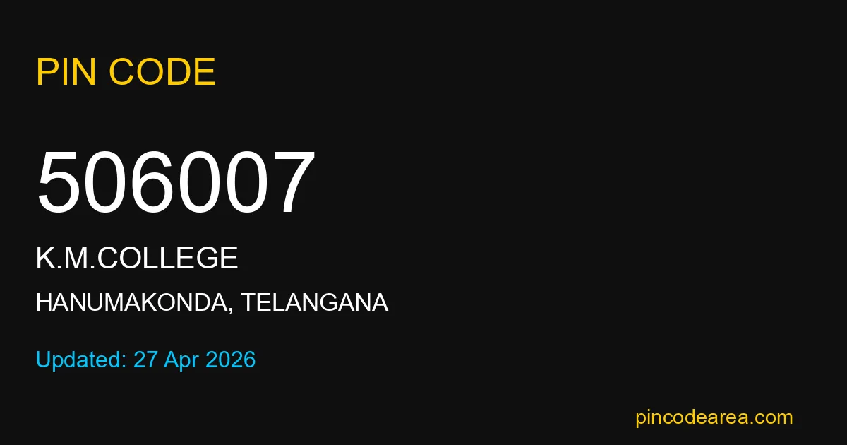 506007 PIN Code is assigned to K.M.College Post Office located in Hanumakonda district of Telangana. It helps identify the exact delivery area for postal and courier services.