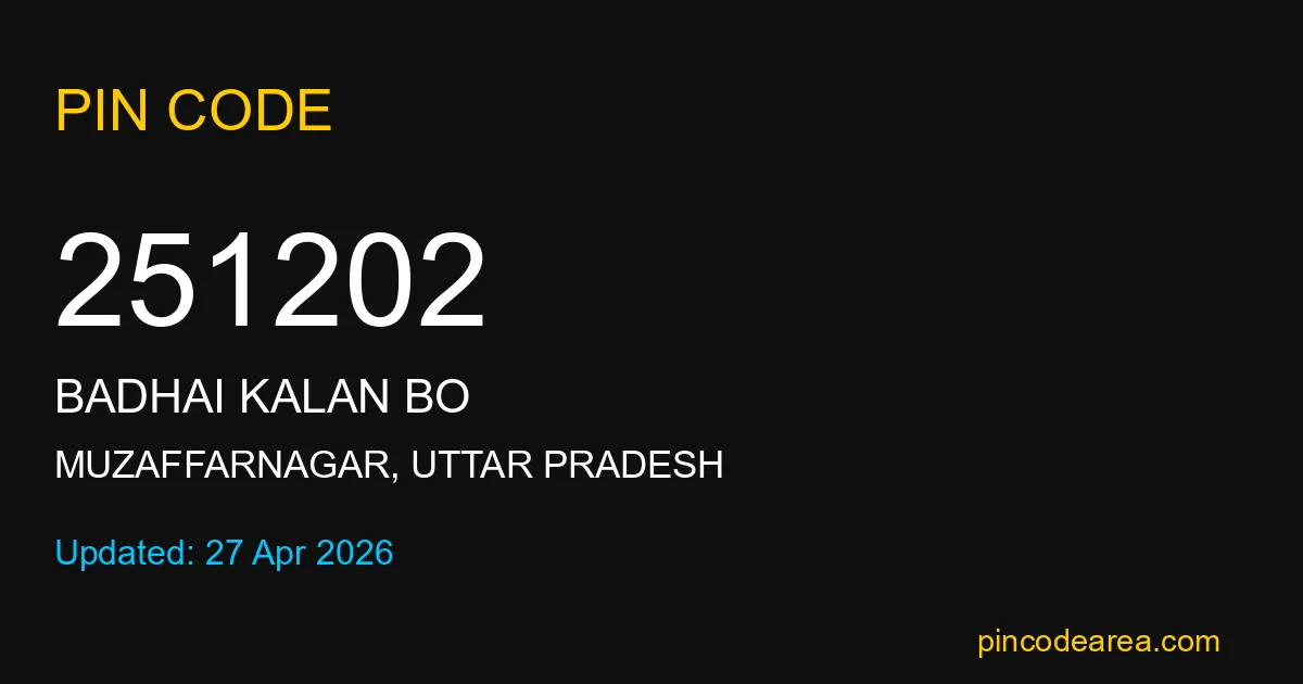251202 PIN Code is assigned to Badhai Kalan BO Post Office located in Muzaffarnagar district of Uttar Pradesh. It helps identify the exact delivery area for postal and courier services.