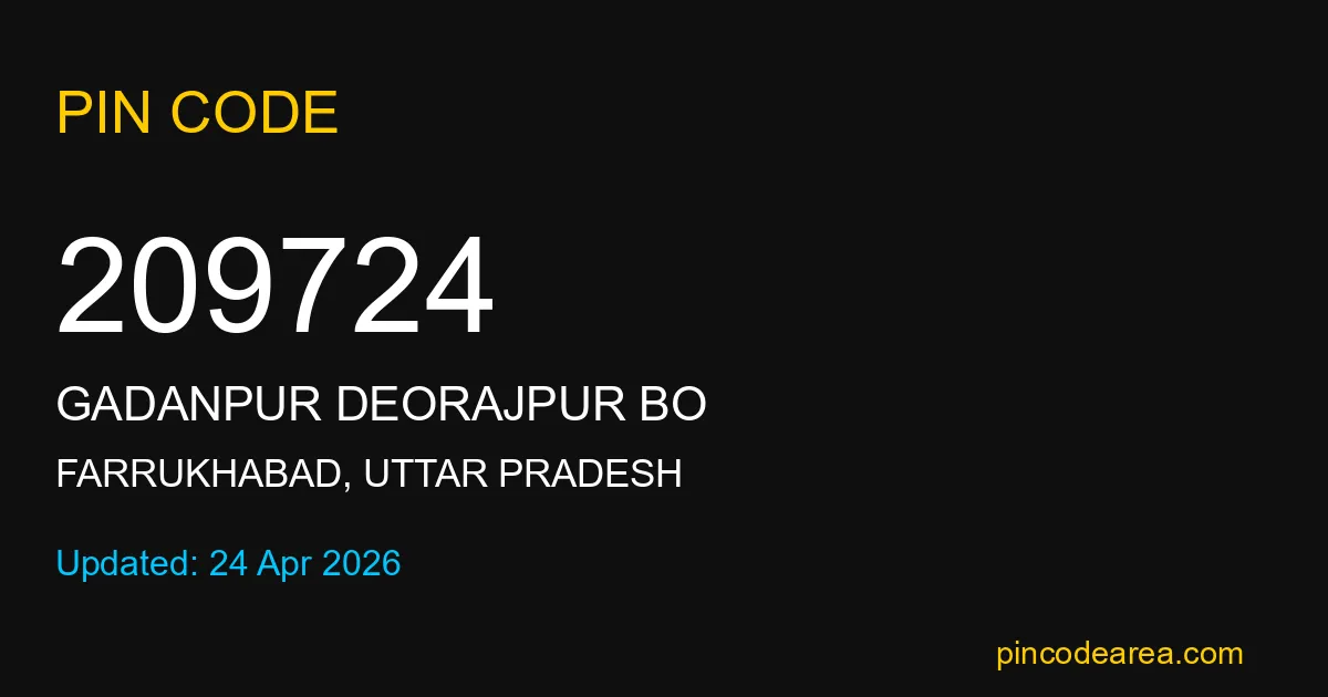 209724 PIN Code belongs to Gadanpur Deorajpur BO Post Office in Farrukhabad district of Uttar Pradesh, India. This area mainly includes local residential and rural regions where India Post ensures timely mail and parcel delivery services.
