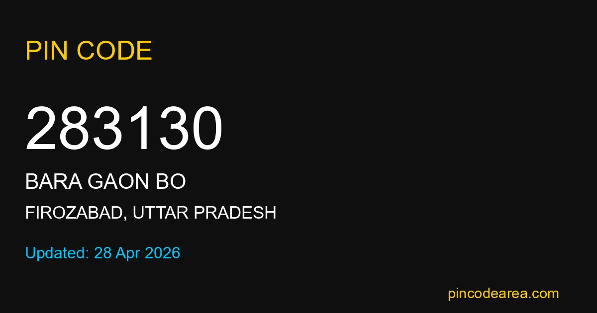 283130 PIN Code is assigned to Bara Gaon BO Post Office located in Firozabad district of Uttar Pradesh. It helps identify the exact delivery area for postal and courier services.