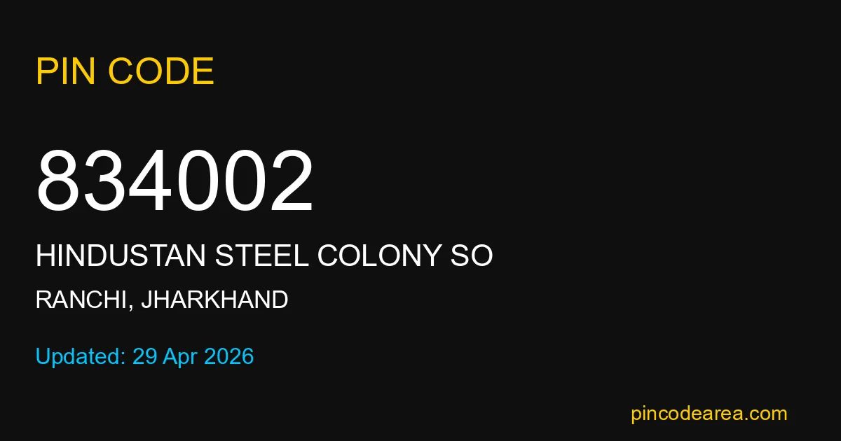 834002 PIN Code is assigned to Hindustan Steel Colony SO Post Office located in Ranchi district of Jharkhand. It helps identify the exact delivery area for postal and courier services.