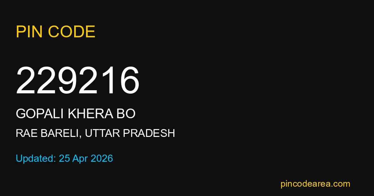 229216 PIN Code is assigned to Gopali Khera BO Post Office located in Rae Bareli district of Uttar Pradesh. It helps in identifying the exact delivery area.