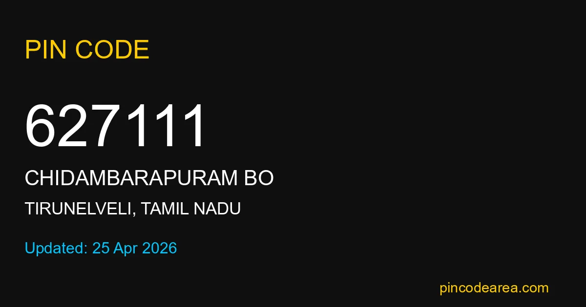 627111 PIN Code belongs to Chidambarapuram BO Post Office in Tirunelveli district of Tamil Nadu, India. This area mainly includes local residential and rural regions where India Post ensures timely mail and parcel delivery services.