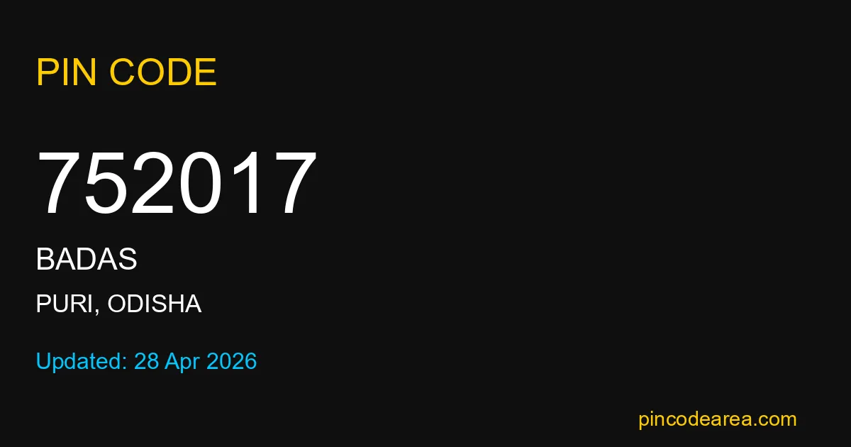 752017 PIN Code is assigned to Badas Post Office located in Puri district of Odisha. It helps identify the exact delivery area for postal and courier services.
