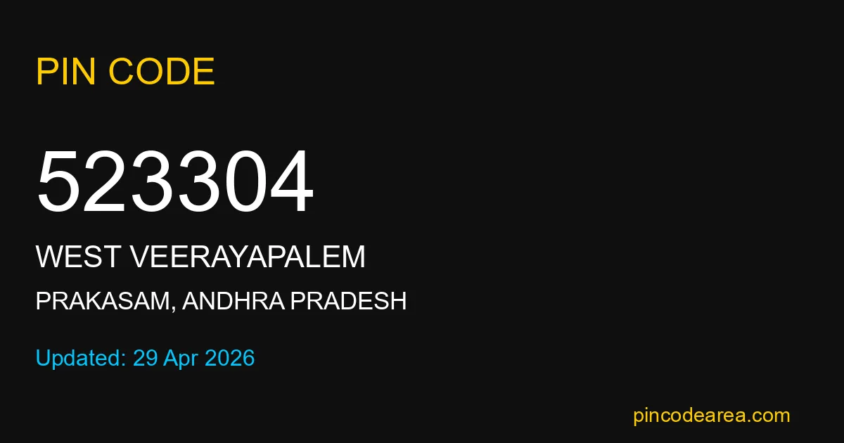 523304 PIN Code is assigned to West Veerayapalem Post Office located in Prakasam district of Andhra Pradesh. It helps identify the exact delivery area for postal and courier services.