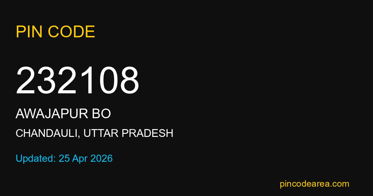 232108 PIN Code belongs to Awajapur BO Post Office in Chandauli district of Uttar Pradesh, India. This area mainly includes local residential and rural regions where India Post ensures timely mail and parcel delivery services.