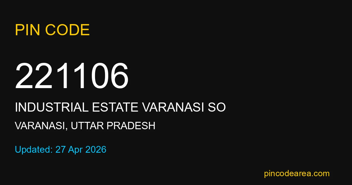 221106 PIN Code is assigned to Industrial Estate Varanasi SO Post Office located in Varanasi district of Uttar Pradesh. It helps identify the exact delivery area for postal and courier services.