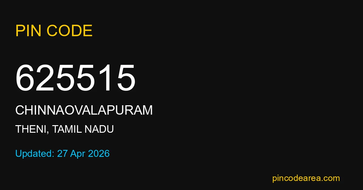 625515 PIN Code is assigned to Chinnaovalapuram Post Office located in Theni district of Tamil Nadu. It helps identify the exact delivery area for postal and courier services.