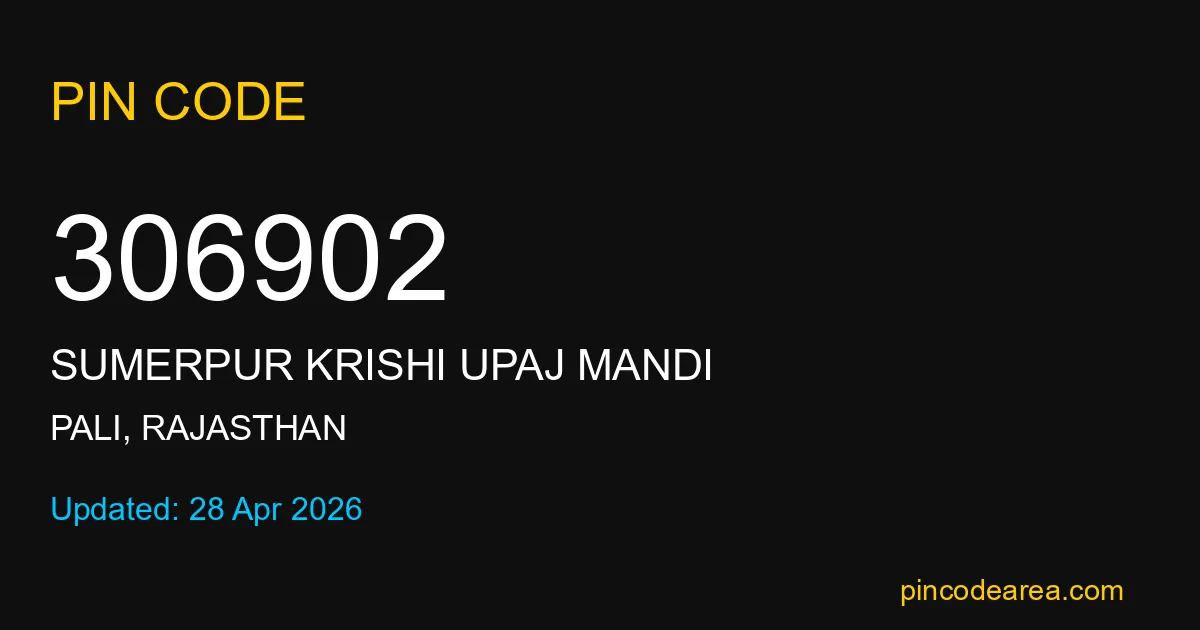 306902 PIN Code is assigned to Sumerpur Krishi Upaj Mandi Post Office located in Pali district of Rajasthan. It helps identify the exact delivery area for postal and courier services.