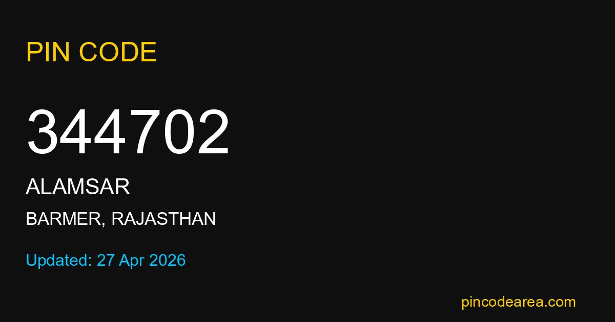 344702 PIN Code is assigned to Alamsar Post Office located in Barmer district of Rajasthan. It helps identify the exact delivery area for postal and courier services.