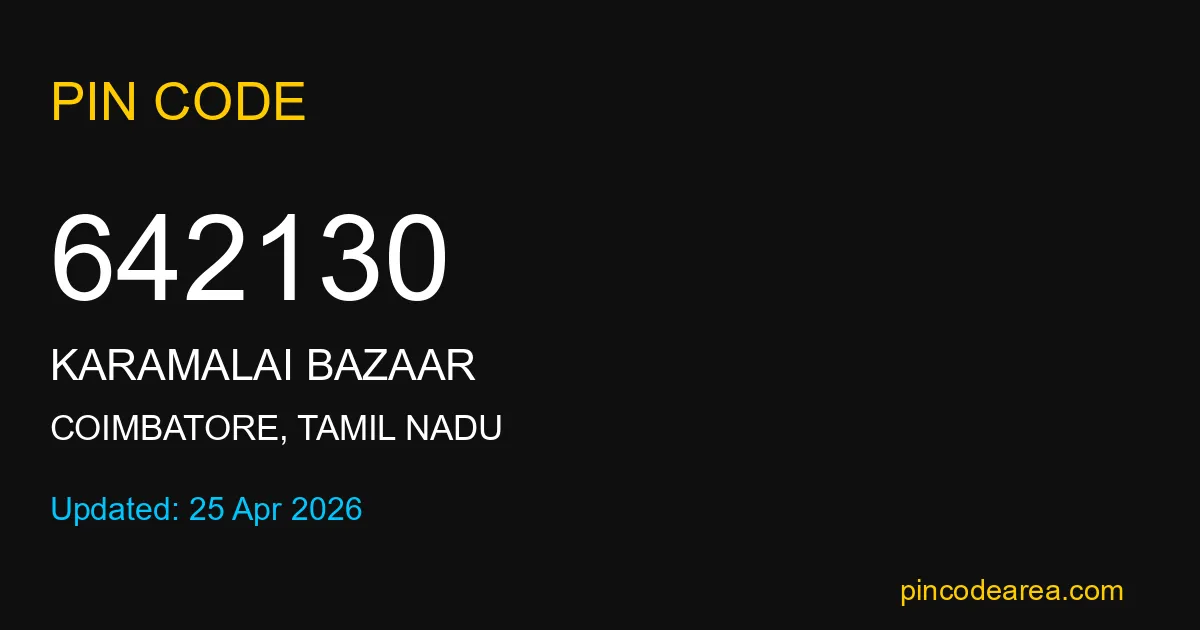 642130 PIN Code belongs to Karamalai Bazaar Post Office in Coimbatore district of Tamil Nadu, India. This area mainly includes local residential and rural regions where India Post ensures timely mail and parcel delivery services.