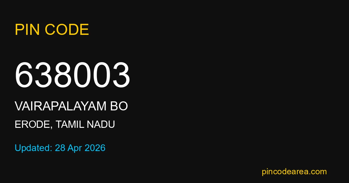 638003 PIN Code is assigned to Vairapalayam BO Post Office located in Erode district of Tamil Nadu. It helps identify the exact delivery area for postal and courier services.