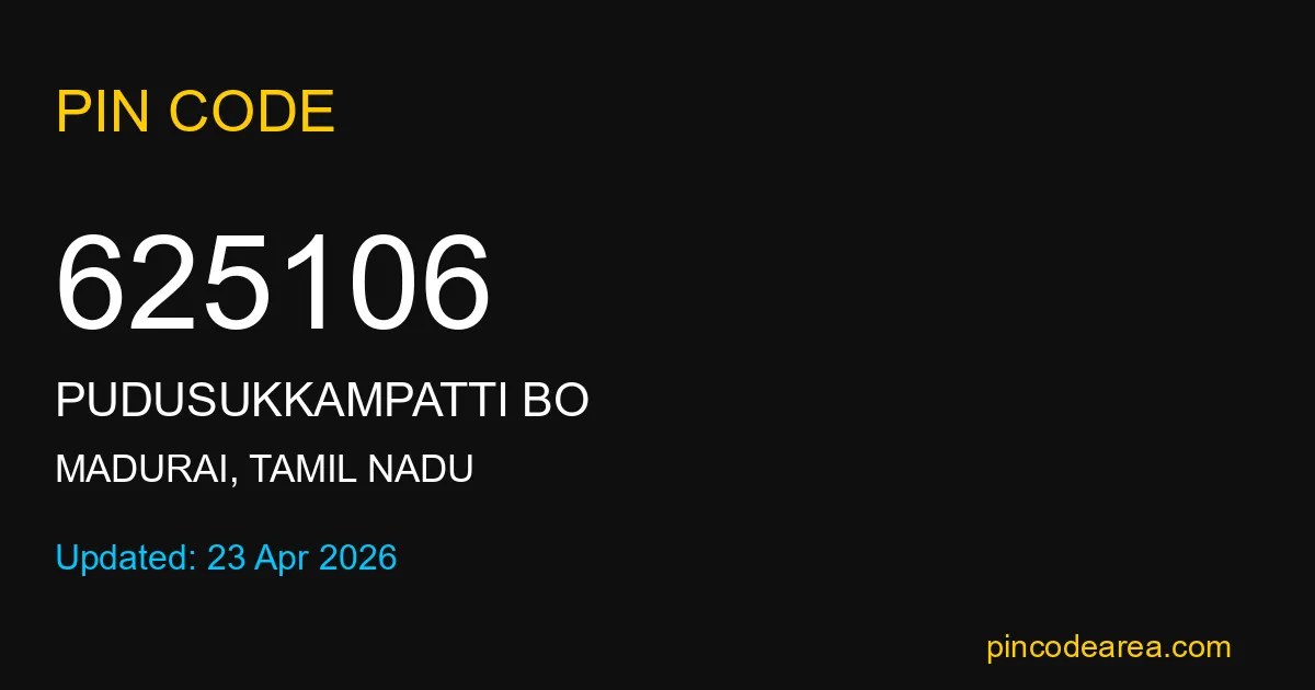 625106 PIN Code belongs to Pudusukkampatti BO Post Office in Madurai district of Tamil Nadu, India. This area mainly includes local residential and rural regions where India Post ensures timely mail and parcel delivery services.