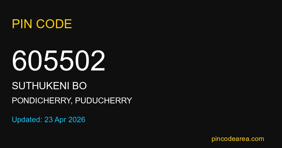 If you are searching for accurate location details, 605502 helps identify the exact postal region of Suthukeni BO in Puducherry.