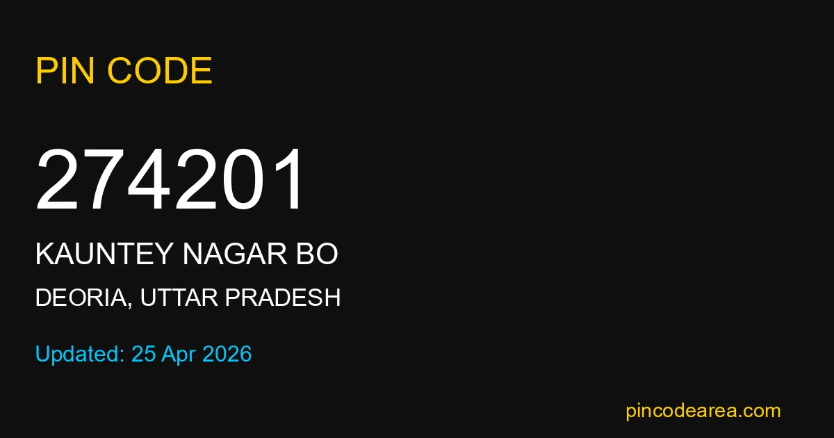 274201 PIN Code belongs to Kauntey Nagar BO Post Office in Deoria district of Uttar Pradesh, India. This area mainly includes local residential and rural regions where India Post ensures timely mail and parcel delivery services.