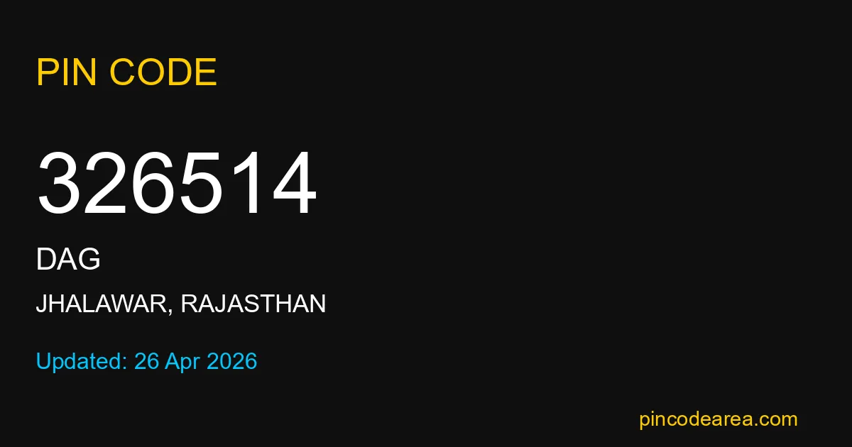 326514 PIN Code is assigned to Dag Post Office located in Jhalawar district of Rajasthan. It helps identify the exact delivery area for postal and courier services.