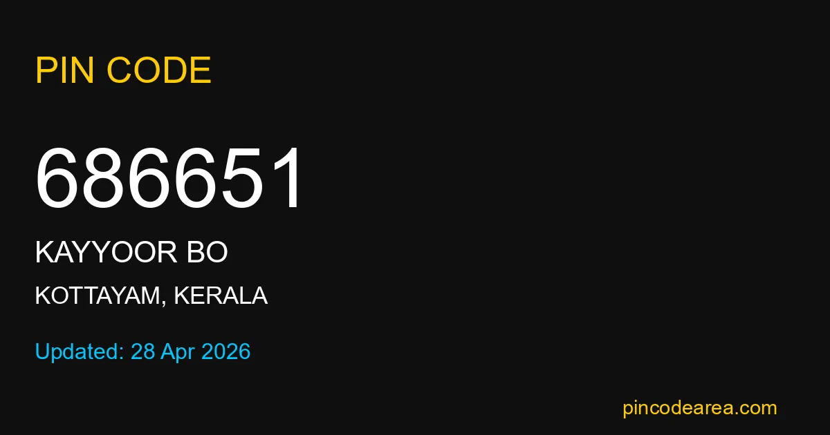 686651 PIN Code is assigned to Kayyoor BO Post Office located in Kottayam district of Kerala. It helps identify the exact delivery area for postal and courier services.