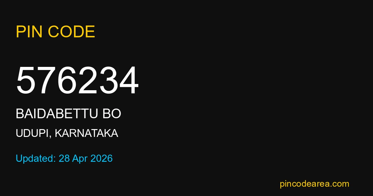 If you are searching for accurate location details, 576234 helps identify the exact postal region of Baidabettu BO in Karnataka.