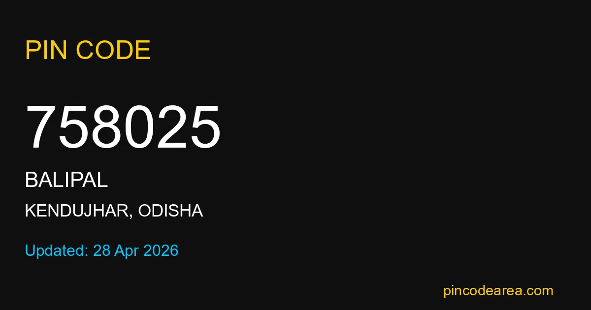 758025 PIN Code is assigned to Balipal Post Office located in Kendujhar district of Odisha. It helps identify the exact delivery area for postal and courier services.