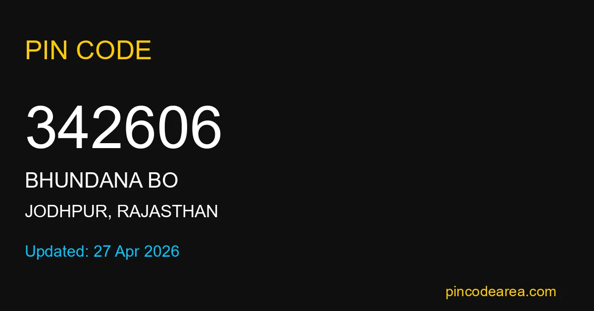 342606 PIN Code is assigned to Bhundana BO Post Office located in Jodhpur district of Rajasthan. It helps identify the exact delivery area for postal and courier services.
