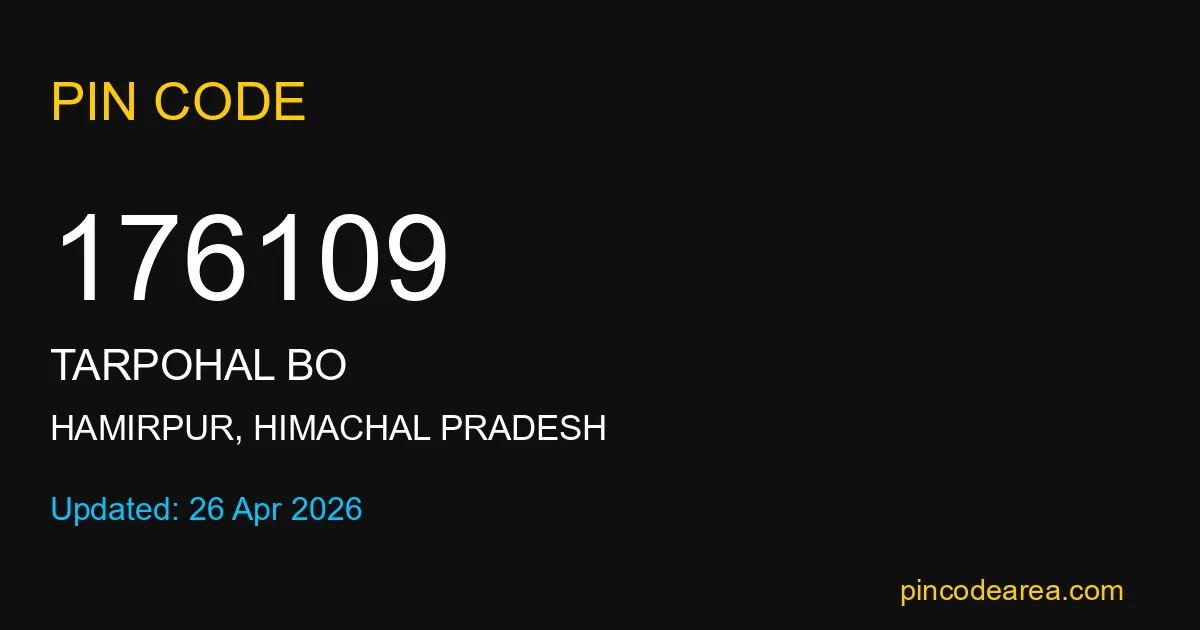 176109 PIN Code is assigned to Tarpohal BO Post Office located in Hamirpur district of Himachal Pradesh. It helps in identifying the exact delivery area.