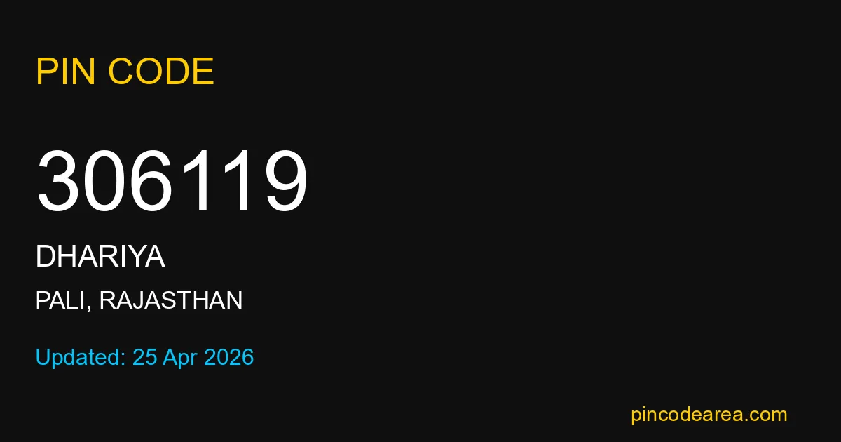 306119 PIN Code is assigned to Dhariya Post Office located in Pali district of Rajasthan. It helps in identifying the exact delivery area.