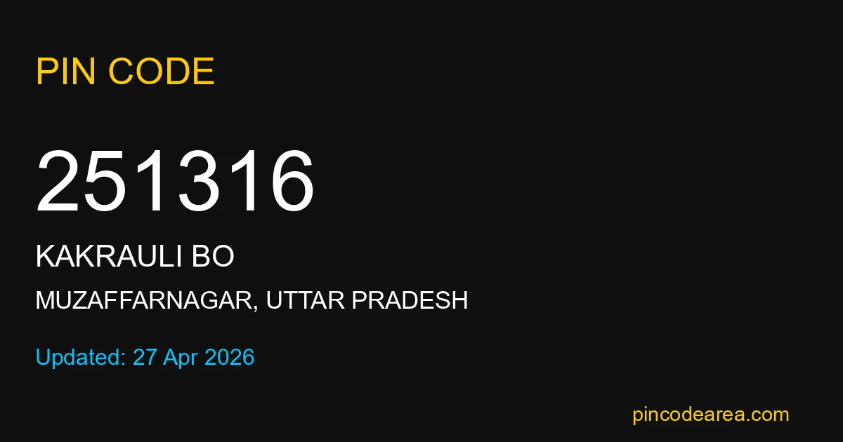 251316 PIN Code is assigned to Kakrauli BO Post Office located in Muzaffarnagar district of Uttar Pradesh. It helps identify the exact delivery area for postal and courier services.