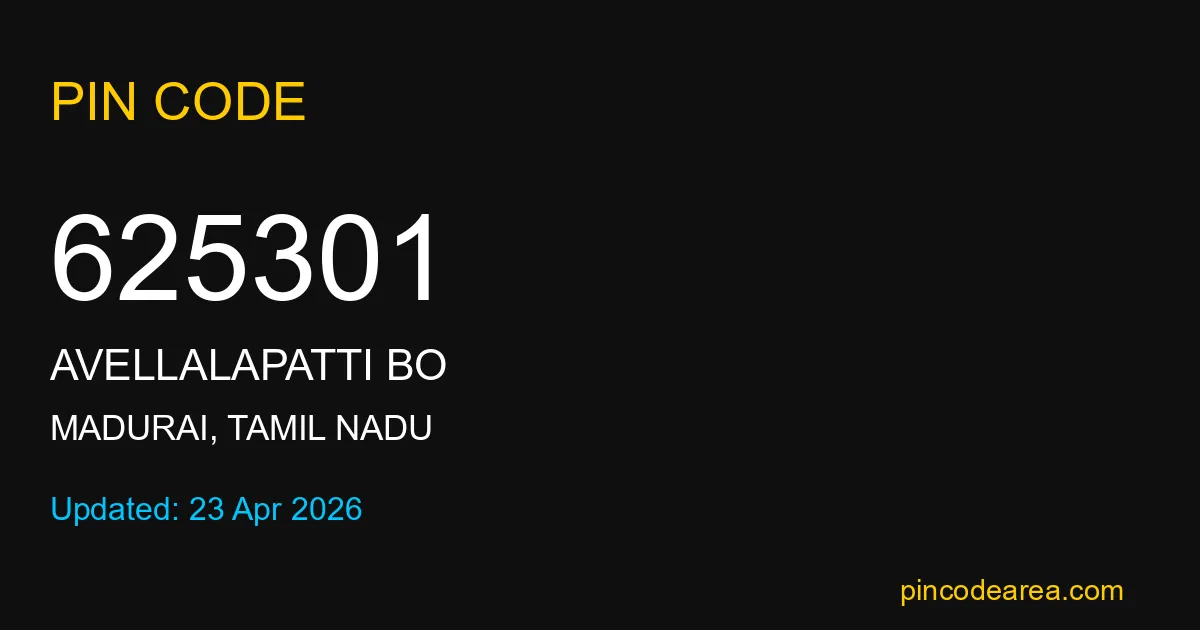 625301 PIN Code belongs to AVellalapatti BO Post Office in Madurai district of Tamil Nadu, India. This area mainly includes local residential and rural regions where India Post ensures timely mail and parcel delivery services.