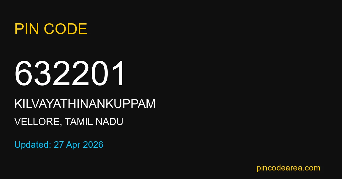 632201 PIN Code is assigned to Kilvayathinankuppam Post Office located in Vellore district of Tamil Nadu. It helps identify the exact delivery area for postal and courier services.