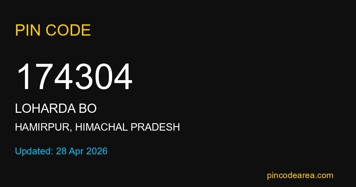 174304 PIN Code is assigned to Loharda BO Post Office located in Hamirpur district of Himachal Pradesh. It helps identify the exact delivery area for postal and courier services.