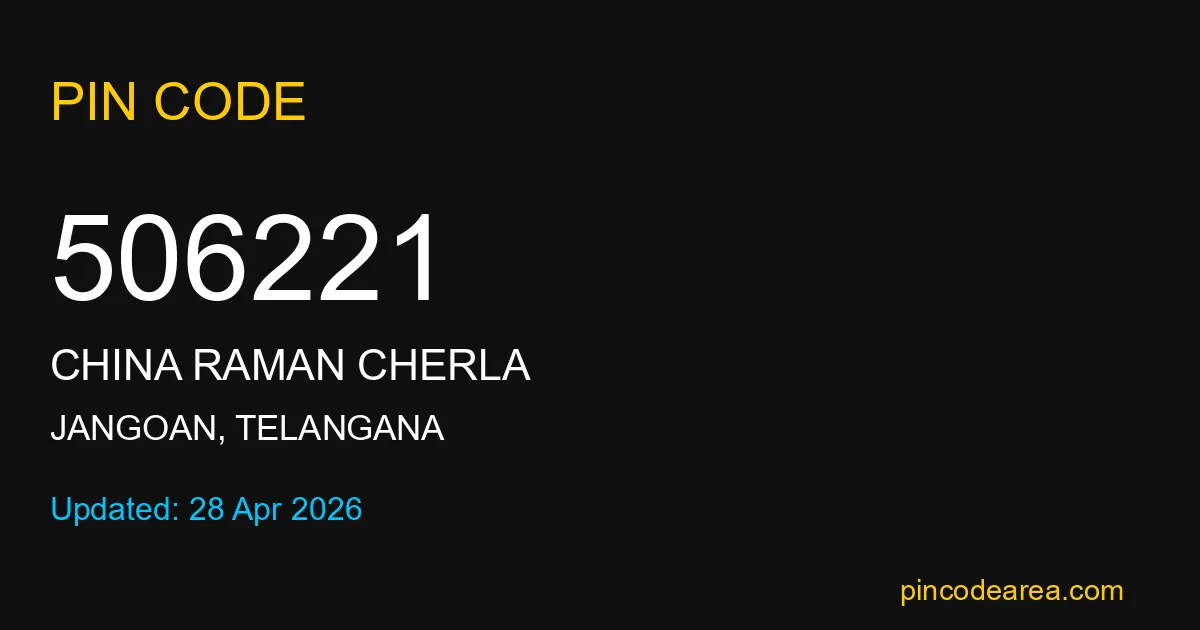 506221 PIN Code is assigned to China Raman Cherla Post Office located in Jangoan district of Telangana. It helps identify the exact delivery area for postal and courier services.