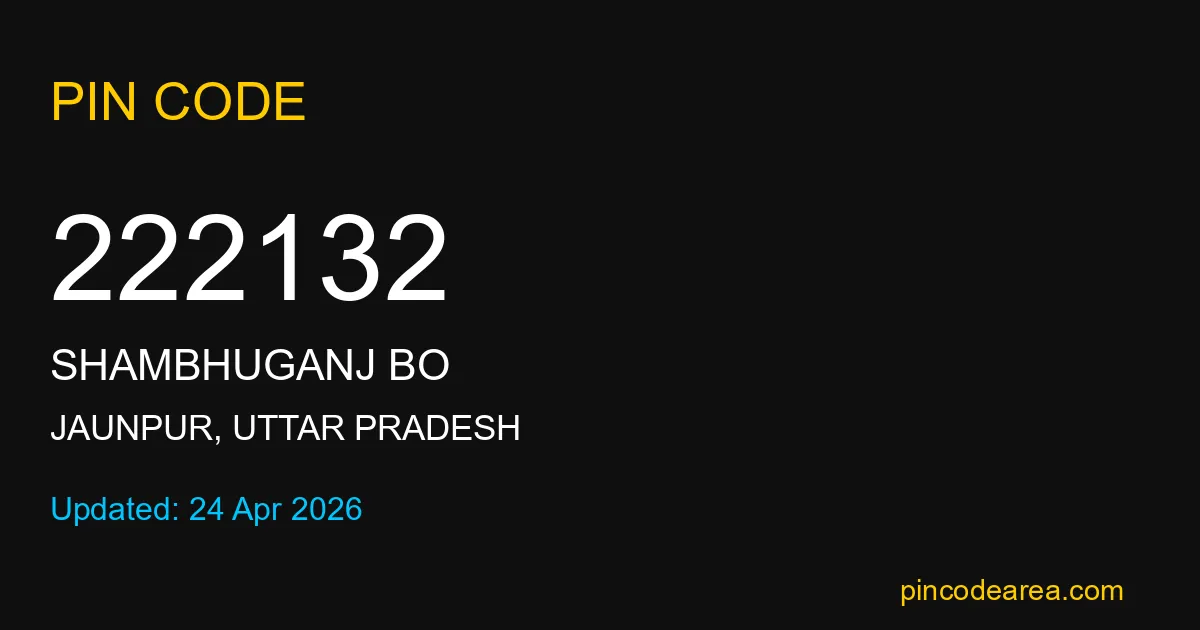 222132 PIN Code is assigned to Shambhuganj BO Post Office located in Jaunpur district of Uttar Pradesh. It helps in identifying the exact delivery area.