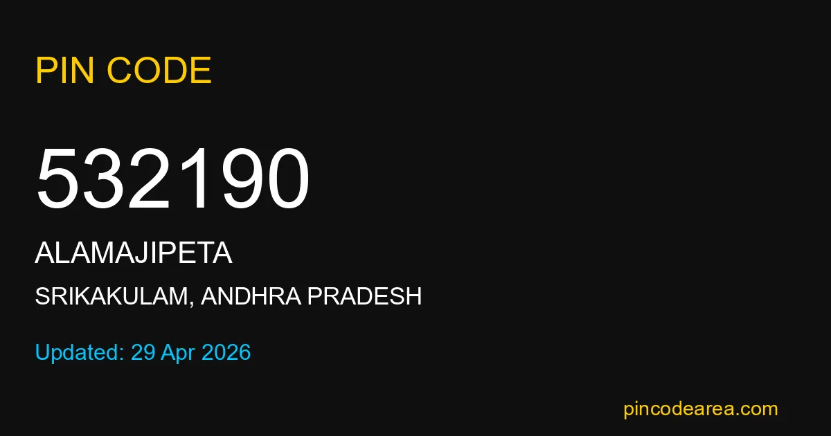 532190 PIN Code is assigned to Alamajipeta Post Office located in Srikakulam district of Andhra Pradesh. It helps identify the exact delivery area for postal and courier services.