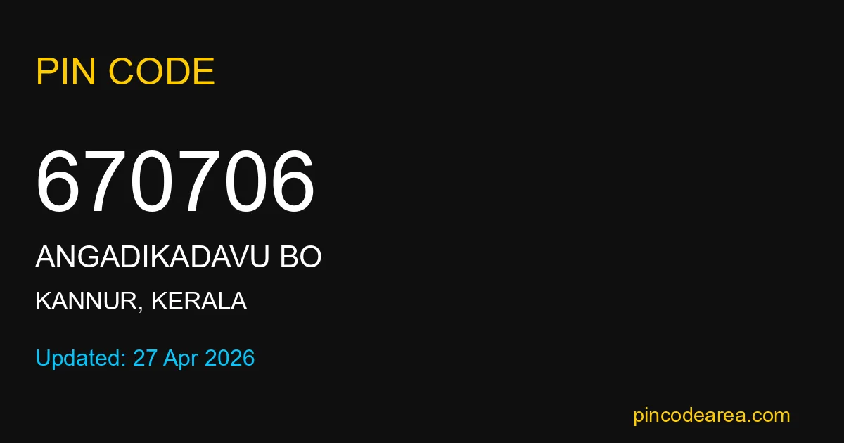 670706 PIN Code is assigned to Angadikadavu BO Post Office located in Kannur district of Kerala. It helps identify the exact delivery area for postal and courier services.