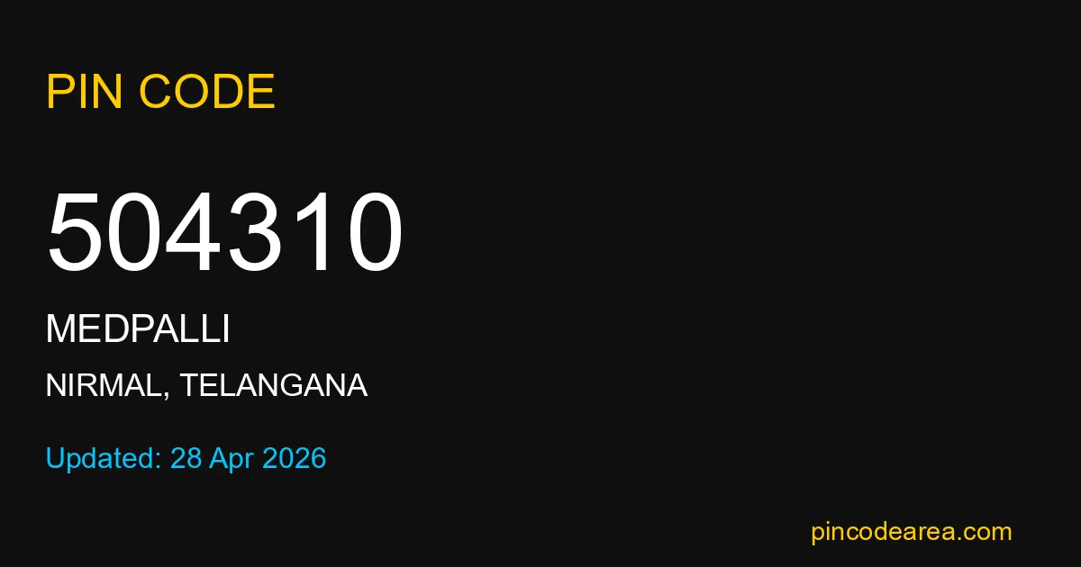 504310 PIN Code is assigned to Medpalli Post Office located in Nirmal district of Telangana. It helps identify the exact delivery area for postal and courier services.