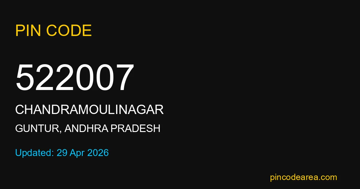 522007 PIN Code is assigned to Chandramoulinagar Post Office located in Guntur district of Andhra Pradesh. It helps identify the exact delivery area for postal and courier services.