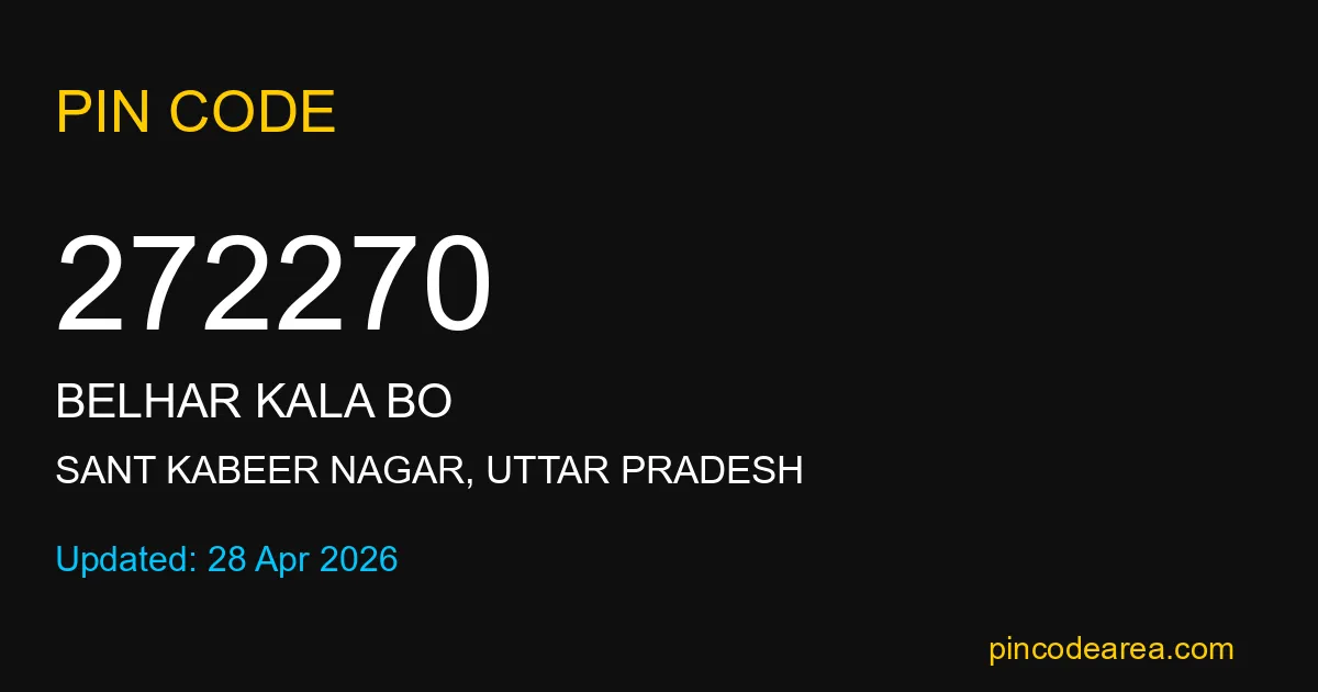 272270 PIN Code is assigned to Belhar Kala BO Post Office located in Sant Kabeer Nagar district of Uttar Pradesh. It helps identify the exact delivery area for postal and courier services.