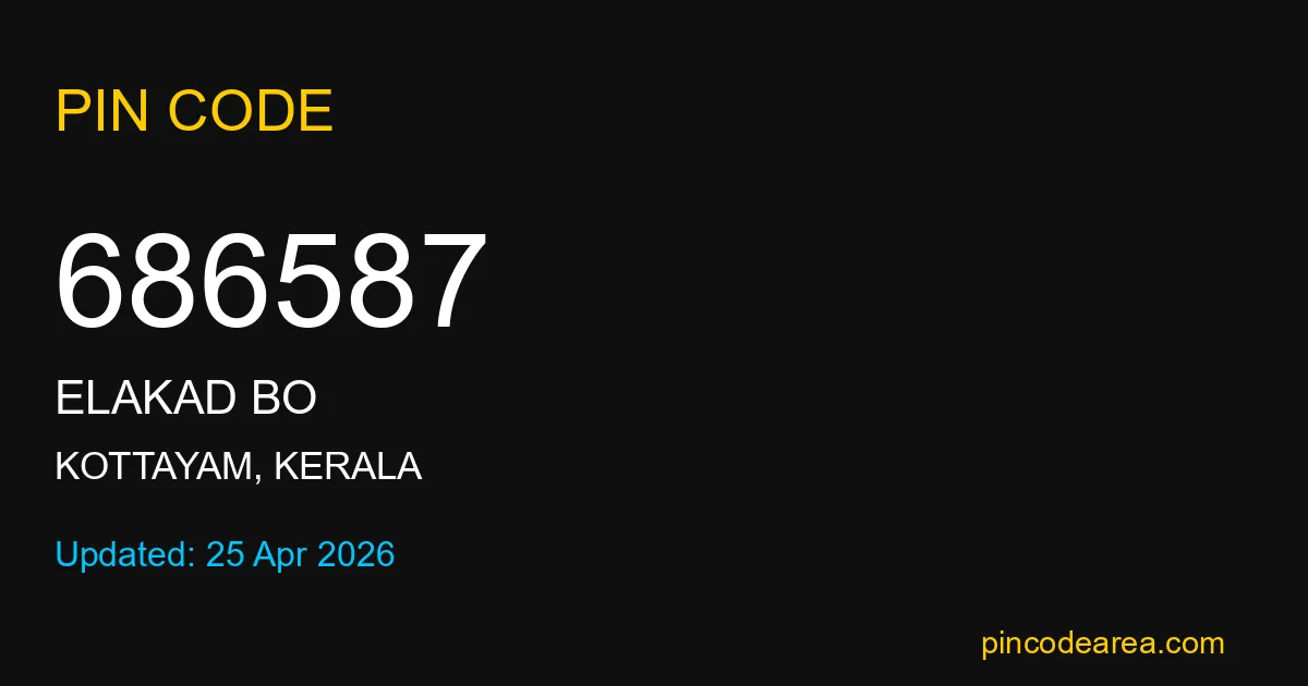 If you are searching for accurate location details, 686587 helps identify the exact postal region of Elakad BO in Kerala.