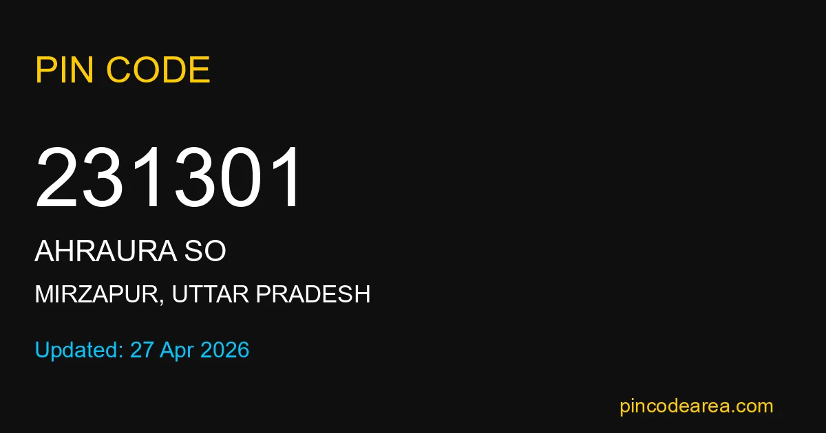 If you are searching for accurate location details, 231301 helps identify the exact postal region of Ahraura SO in Uttar Pradesh.