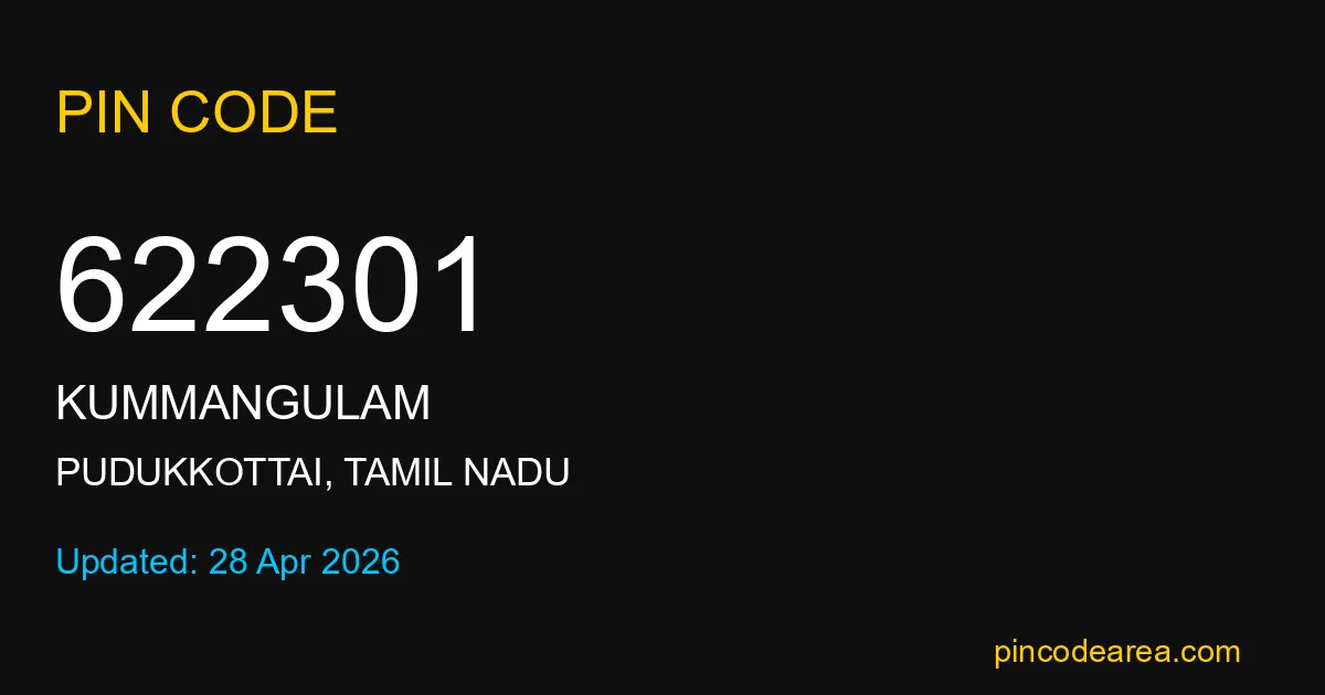 622301 PIN Code belongs to Kummangulam Post Office in Pudukkottai district of Tamil Nadu, India. This area mainly includes local residential and rural regions where India Post ensures timely mail and parcel delivery services.